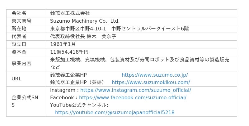 1981年に世界初の寿司ロボットを開発し、寿司の大衆化を実現したリーディングカンパニーです。米飯加工ロボットにおいて国内外で高いシェアを占め、お寿司、おにぎり、丼ものなど、世界中の様々な食のシーンで幅広く利用されています。近年では、ご飯盛り付けロボットシェアNo.1(出典:富士経済:「2022 年版 ワールドワイドロボット関連市場の現状と将来展望」 米飯盛付けロボット 販売金額・台数 2021 年実績)を獲得や、「Fuwarica(ふわりか) GST-MRA」が、「第25回外食産業貢献賞(日本食糧新聞社主催)」を受賞するなど、業界でも注目を集めております。『食の「おいしい」や「温かい」を世界の人々へ』を掲げ、細分化する食に関するニーズをいち早く捉えて市場にご提案し、常に新しいフードビジネスを開拓する企業として躍進しています。