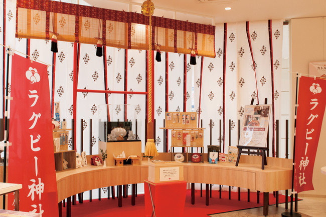 日本でラグビーワールドカップの開催された2019年9月梅林堂箱田本店店内に地域とスポーツの振興のため建立された神社。正式名称は寿康神社。ご神体はガラス製のボールに熊谷市の佐谷田神社に祀られている天手力男命(あめのたぢからおのみこと)はじめとする神々を御霊分けいただきました。ラグビーボールは公式ラグビーボールと同じ大きさで、内部にご神鏡が入る小さな空間も作ってあります。左右の狛犬は、ラグビーボールを持ち、目に赤、足元の装飾に緑、黄色、白、紫を使い、神社の「五色の旗」を表現しています。