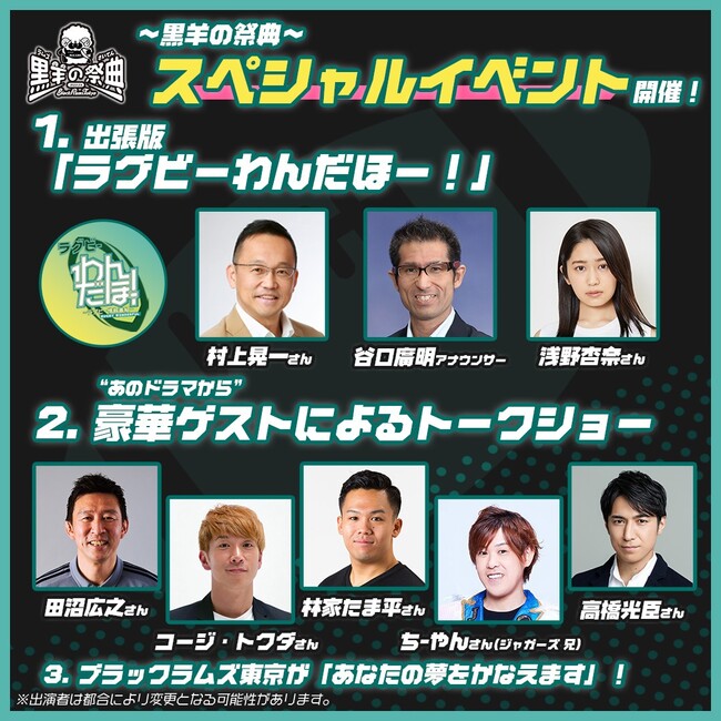 高橋光臣さん、林家たま平さん、コージ・トクダさん、「ジャガーズ」ちーやんさんなどラグビーにゆかりのある豪華ゲストをお招きし、ブラックラムズ東京 田沼広之アンバサダーとともにトークショーをおこないます。