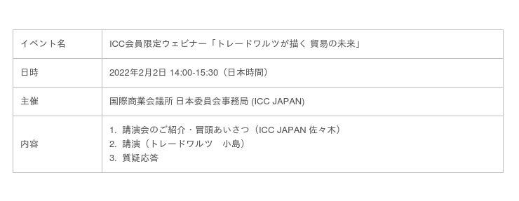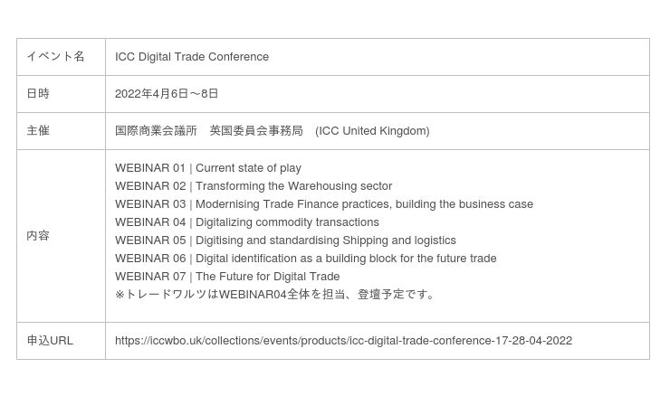 そういった背景から、ICC 英国委員会主催で、2022年4月には下記内容にて、貿易デジタル化に取り組む世界の主要プレーヤーを集めたICCデジタル貿易カンファレンスが開催されます。日本からはトレードワルツが登壇致します。ICCの非会員企業でも視聴可能ですので、是非ご参加ご検討下さい。
