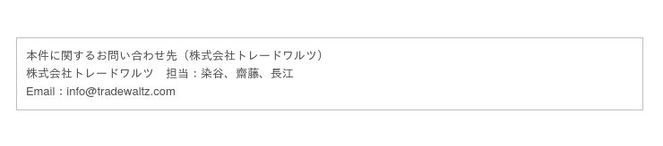 (注1)「TradeWaltz」は日本国内における株式会社トレードワルツの登録商標です。その他の商品名、会社名、団体名は、各社の商標または登録商標です。