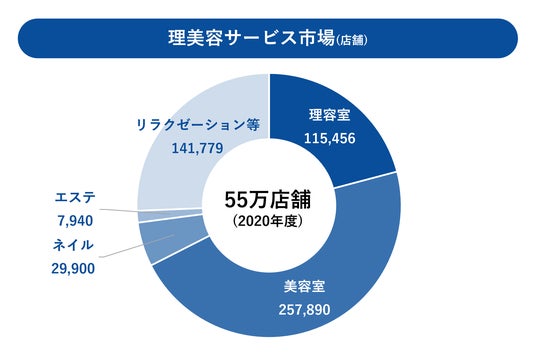 2023年現在、理美容サービス市場は、理容室・美容室・ネイルサロン・エステサロン・リラクゼーション等で構成されており、約55万店舗ととても大きな市場となっております。