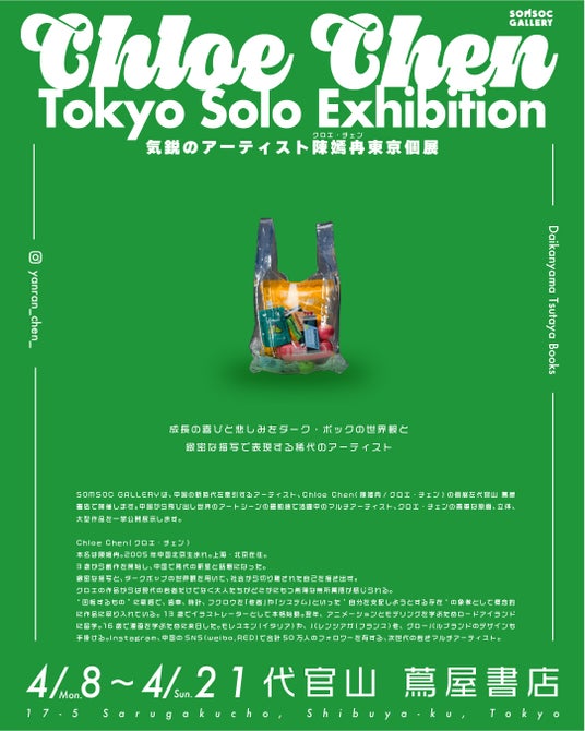 研美株式会社(本社:東京都渋谷区 代表取締役:厳研)が運営するクリエイターズユニット兼ギャラリー機能を有する「SOMSOC GALLERY(ソムソクギャラリー)」は、成長の喜びと悲しみをダーク・ポックの世界観と緻密な描写で表現する稀代のアーティスト、Chloe Chen(クロエ・チェン)の東京個展を代官山 蔦屋書店で開催します。期間は、2024年4月8日(月) から4月21日(日)までとなります。