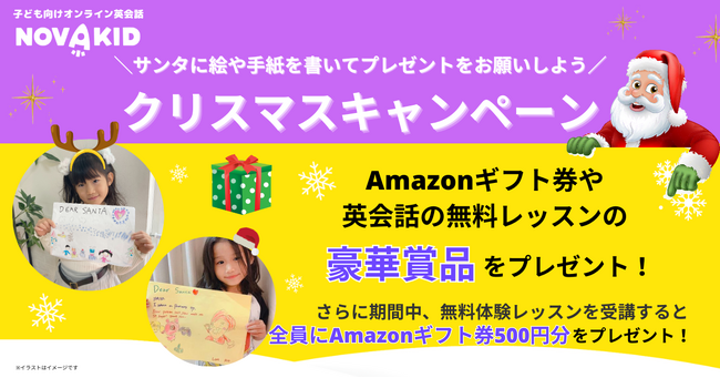 ノバキッドは、クリスマスを通じて子どもたちが英語で表現するきっかけを提供する場として、サンタへ英語で手紙や絵を描いて発表するSNS(インスタグラム)キャンペーンを開催します。キャンペーンに参加していただいた方の中から抽選で、Amazonギフト券やノバキッドの無料のオンライン英会話レッスンなどの豪華賞品を合計5名様にプレゼントいたします。さらにキャンペーン期間中にノバキッドの無料体験レッスンを受講すると、もれなく受講者全員にAmazonギフト券500円分をプレゼント!