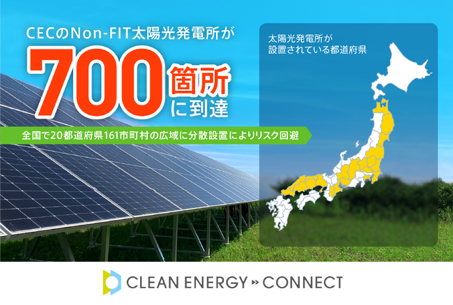 脱炭素経営企業、RE100参加企業等のお客様に対してNon-FIT太陽光発電によるグリーン電力と環境価値をお届けする株式会社クリーンエナジーコネクト(代表取締役:内田鉄平、以下「クリーンエナジーコネクト」)は、発電を行っているNon-FIT太陽光発電所が、合計700箇所になりましたのでお知らせします。
