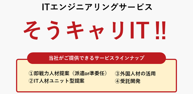 「そうキャリIT!」は、総合人材会社である綜合キャリアオプションが、ITエンジニアを求めるクライアントに対し、様々な専門スキルを持つ豊富な人材から、クライアントの要望に合わせた最適な提案を行うサービスです。