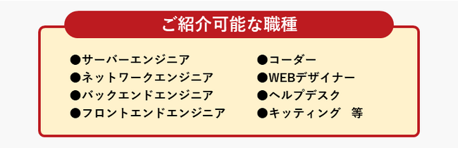サーバーエンジニアやネットワークエンジニアのほか、WEBデザイナーやヘルプデスクなど、ITにまつわる幅広い人材をクライアントにご紹介するシステムです。