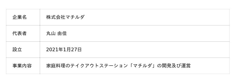 株式会社オリエンタルランド・イノベーションズ(代表取締役社長:麻畠 万暉、以下「オリエンタルランド・イノベーションズ」)は、「こどもが無邪気でいられる社会を創る」をミッションに掲げ、家庭料理のテイクアウトステーション「マチルダ」の開発及び運営を行う株式会社マチルダ(代表取締役:丸山 由佳、以下「マチルダ」)に出資いたしましたので、お知らせいたします。