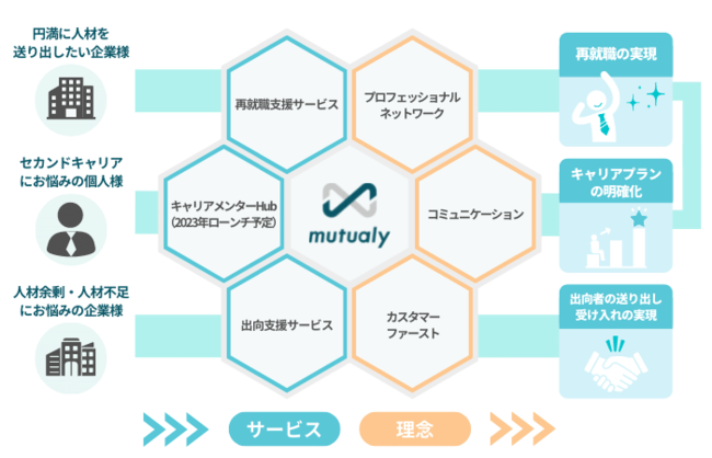 mutualyは「人材余剰の企業様」と「人材不足の企業様」をお繋ぎし、再就職支援や在籍出向の仕組みを使いながら人材のシェア・移動の最適化を提供するサービスです。