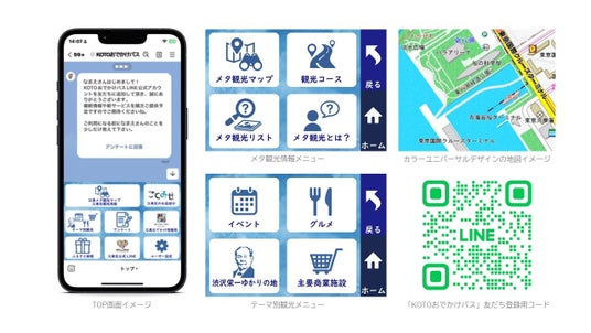 東京都江東区が提供する「KOTOおでかけパス」は、江東区内を観光する時に役立つ様々な情報が搭載されたLINE公式アカウントです。おすすめグルメスポットやイベントなどの情報のほか、江東区のメタ観光(※1)マップとも連携し、「ドラマのロケ地」や「テレビで紹介されたスポット」、「浮世絵の名所」といった深堀り情報も余すところなく詰め込まれています。区内のお店で使用できるクーポン情報を掲載している「ことみせ」サイトにもアクセスでき、友だち登録をするだけでお得にエリア内の観光を楽しむことができます。