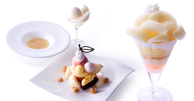 洋梨をさまざまな仕立てて楽しめるアソートタイプの一品です。洋梨のスープ、シャーベット、プレートには紅茶ブリュレをつめこんだ洋梨の果肉を。ダマンドやブラウニーとともにケーキ感覚でお召し上がりいただけます。