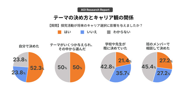 調査の結果、探究活動のテーマを生徒自身が決定、または選択をすることで、探究活動が将来のキャリア選択に影響を与える可能性が、テーマを学校や教員、もしくは班で決める場合に比べて2倍以上高いことがわかりました。