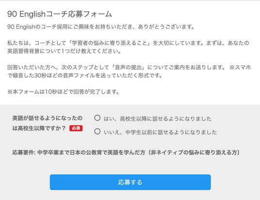 採用条件である「中学卒業まで日本の学校で英語を学び、高校生以降に英語を話せるようになった方」かどうかを確認する質問のみです。志望動機・英語スコア・履歴書の提出は不要。お名前や職業、志望動機などは面接前アンケートにてご記入いただきます。
