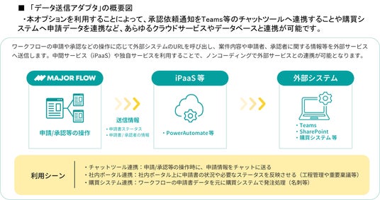 そのようなお声にお応えし、今回の新バージョンでは、MAJOR FLOWでエントリーされた申請データをシームレスに連携可能なWebhook連携オプション「データ送信アダプタ」の提供を開始しました。昨今、DX推進やテレワークの普及により、ビジネス文書の電子化が進んでおります。入力されたデジタルの文書を保管するだけではなく、周辺システムへ情報の流れを一本化することが可能です。稟議等の決裁データを活用し、データドリブン経営を支援します。