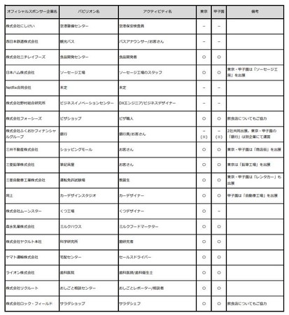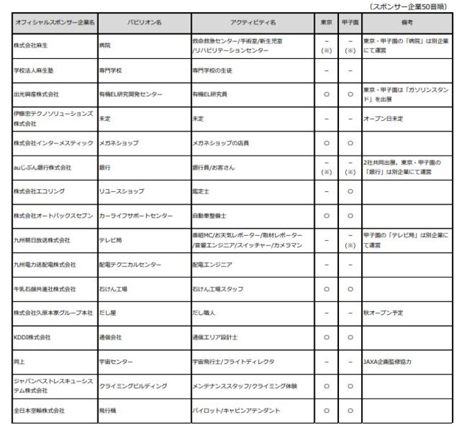 ・「東京」は「キッザニア東京」への出展有無、「甲子園」は「キッザニア甲子園」への出展有無を表します。備考欄に記載がある場合を除き、「キッザニア福岡」のパビリオン名や内容は同様の予定です。