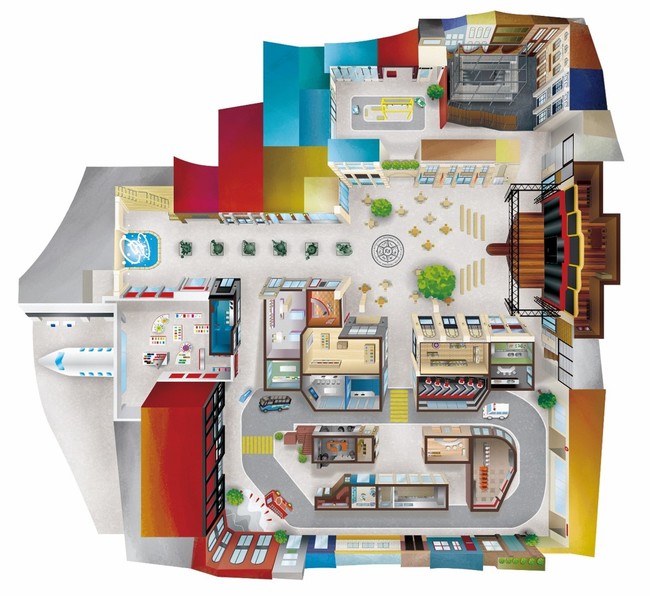 江東区)や「キッザニア甲子園」(兵庫県西宮市と同じ、飛行機の離発着がなされる「空港」を表現した入場ゲートが目印です。空港の先には、約2/3サイズで現実社会を表現したおよそ2,000坪(6,600平米)の「こどもが主役の街」が広がり、3歳から15歳のこども達は、約60のパビリオンで約100種類の仕事やサービスを体験できます。仕事体験後にはお給料として専用通貨「キッゾ」が支給され、施設内での買い物やサービスに使えるほか、施設内の金融機関に「預金」も可能。楽しみながら社会のしくみを学べる「エデュテインメント」をコンセプトとしています。