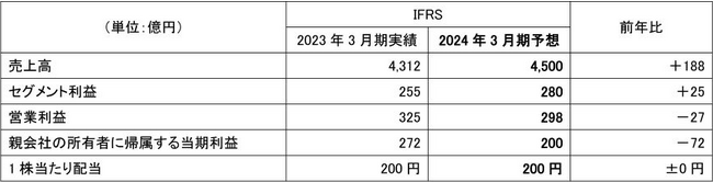 併せて、2024年3月期の業績予想を連結売上高4,500億円(188億円増)、セグメント利益280億円(25億円増)、営業利益298億円(27億円減)、最終利益(親会社の所有者に帰属する当期利益)200億円(72億円減)とした。