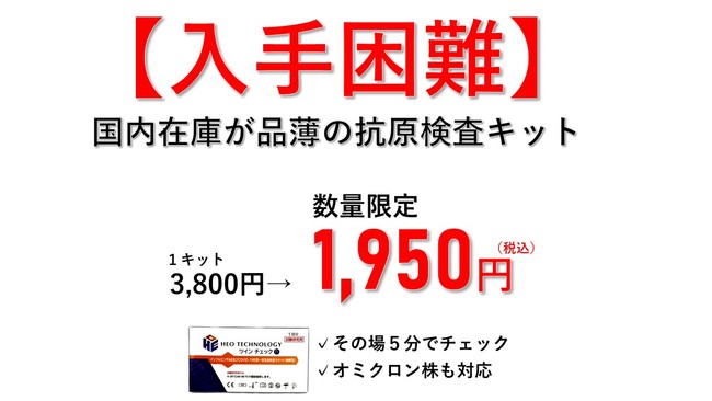 少しでも感染拡大防止に努めたいとの思いから、弊社では通常1キットあたり3,800円(税込)の抗原検査キットを、約50%オフの1,950円(税込)での販売を開始いたします。