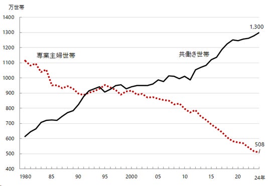 以下は専業主婦世帯と共働き世帯の推移(1980年~2024年)である。
