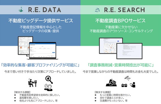 「R.E.DATA」は、インターネット上に存在しない役所、法務局や現地のみに存在するアナログな不動産情報を中心にビッグデータを形成し、法人顧客に対して、オーダーメードでデータを収集・分析・整備し、マーケティングに関する課題を解決するサービスです。