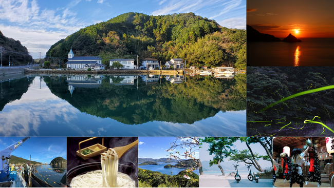 長崎から西へ100キロ。新上五島町は7つの有人島と60の無人島から構成され、豊かな自然の恵みにあふれる歴史と文化に彩られた島です。海岸線の多くは西海国立公園に指定されており、島々が複雑に入り組んだ碧い海と深緑の山々が織りなすコントラストは、美しい自然景観を形成しています。海を見下ろす高台や入り組んだ小径の奥には教会が、また海岸沿いには国内有数の漁場や国境の島の歴史の生き証人としての神社やお寺が佇んでおり、旅先として人気が高まっています。