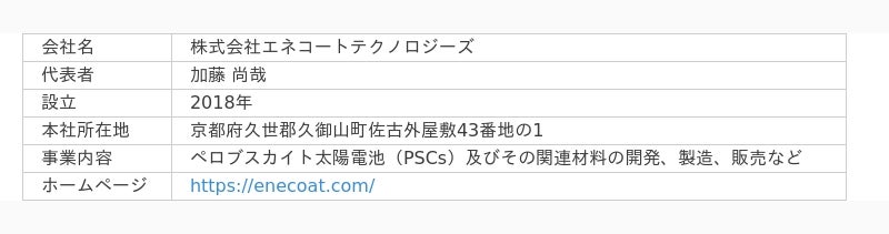 エネコートは、京都大学化学研究所の若宮淳志教授らの研究成果をもとに、ペロブスカイト太陽電池の開発を行うスタートアップです。ペロブスカイト太陽電池は、現在主流となっている太陽電池と比べ、「屋内のような低照度環境下での高い発電効率」「柔軟性」「軽量」といった特長を有し、既存の太陽光パネルが設置困難な建物壁面や支柱、耐荷重の弱い倉庫の屋根等での発電が可能となることが期待されています。