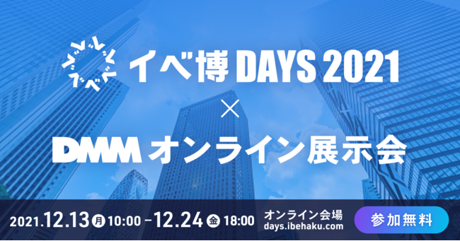 合同会社DMM.com(東京都港区、会長 兼 CEO 亀山敬司 以下、「DMM」)が展開するDMMオンライン展示会は、bravesoft株式会社(本社:東京都港区、代表取締役:菅澤英司)が主催する、イベントに関わるすべての人が最先端テックに触れながらイベントの未来を再定義するハイブリット開催の展示会「イベ博DAYS 2021」に、2021年12月13日(月)~24日(金)の期間でオンライン出展いたします。