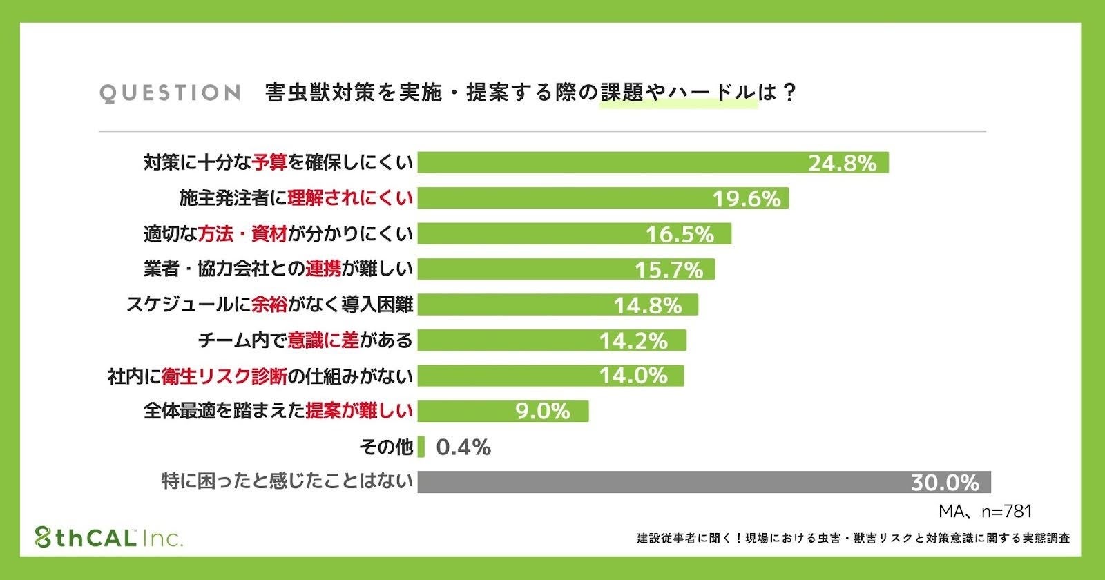 - 対策時の課題は「予算確保の難しさ」(24.8%)、「施主の理解不足」(19.6%)、「手法や資材が分かりにくい」(16.5%)が上位