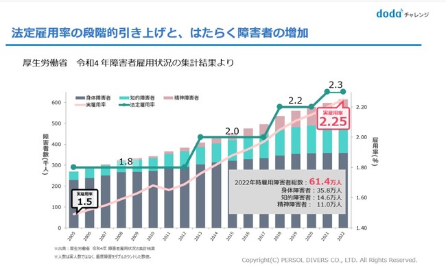 過去最大の引き上げ幅となる法定雇用率引き上げに加え、ダイバーシティやESG等の社会的潮流によって雇用を取り巻く環境は大きく変化していく中、企業は法定雇用率の達成に留まらず、採用拡大、採用後の定着・活躍、戦力化に取り組むことが求められます。