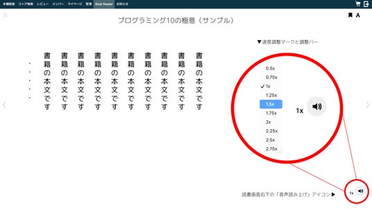 本機能は、書籍データを新たに複製・変換することなく、ブラウザやデバイスの標準機能として従前より提供されている「音声読み上げ機能」を、書籍の閲覧画面から有効化できるようにしたものです。出版社各社よりお預かりしている大切なコンテンツデータの取り扱い方針を順守し、Sharelot上でのアクセシビリティ向上を目的として実装いたしました。