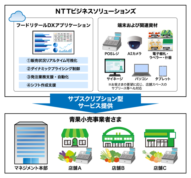 今後、MongTeng「Una casita ヨシヅヤ津島店」での実証開始後、MongTeng既存15店舗、および、新規店舗への導入実証を進め、小売事業経営における本ソリューションのDX効果検証を進めていきます。また、NTTビジネスソリューションズは、MongTengとの本実証で得た知見を踏まえ、青果小売事業のDXによりフードロス削減、売上粗利拡大、少数マネジメントスタッフによる効率的な多店舗運営により事業収益拡大を支える本ソリューションの商用化(図2:サービス提供イメージ)をめざします(2023年度下期予定)。