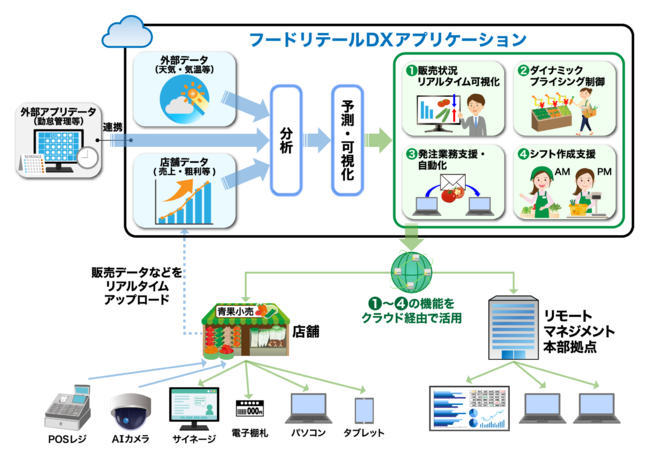 このような課題解決のために、本ソリューションでは、各店舗にネットワーク端末を導入し、販売データをリアルタイムにクラウドに取得・蓄積します。また、収集したデータを分析・可視化し、売価設定・発注・人員配置などを最適化する店舗運営DX機能(図1中1.~4.)、および、本部拠点からクラウドシステムを通じてDX機能を活用し、店舗運営のリモートマネジメントを行うクラウド型店舗マネジメント機能を実現します。