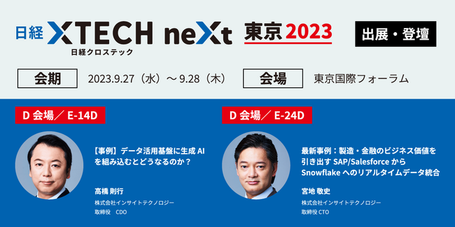 株式会社インサイトテクノロジー(本社所在地:東京都渋谷区、代表取締役社長 CEO:森田 俊哉、以下:インサイトテクノロジー)は、2023年9月27日(水)~28日(木)に東京国際フォーラム(東京・有楽町)で開催される「日経クロステックNEXT東京」に出展することをお知らせします。
