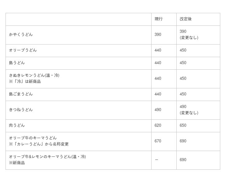 なお、この価格改定にあわせて、うどん麺の「増量(230g → 250g)」を行い、満足度の向上を目指すこととしております。