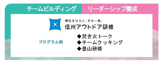 信州の自然環境を生かした新規事業として2022年4月に本格スタート。23年10月までに46社301人が受講。日帰りの「登山研修」や「チームクッキング」「焚き火トーク」などの野外活動を取り入れ、受講者が予期せぬ出来事に遭遇しながら目標達成を目指す過程で、コミュニケーション力やリーダーシップなどを鍛えます。座学とは異なる成果が期待できる研修として長野県内外の企業などに提案しています。