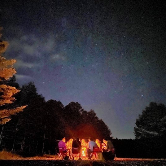 この日初めて会った30~60代の受講者が語り合ったモニターツアーでの「焚き火トーク」(セルフストーリー)=2023年9月、長野県東御市の湯の丸高原キャンプ場(標高約1700m)