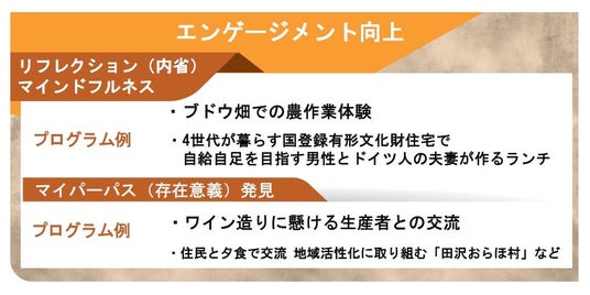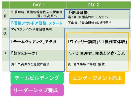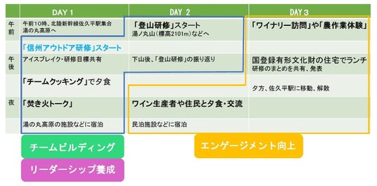 焚き火トークやチームクッキング、登山研修などの野外アクティビティを盛り込んだ「信州アウトドア研修」(信濃毎日新聞社主催)を軸に、リフレクション(内省)やマインドフルネスなどを目的に、ワイン用ぶどうの畑などでの農作業体験や生産者、住民の交流といったプログラムを用意します。