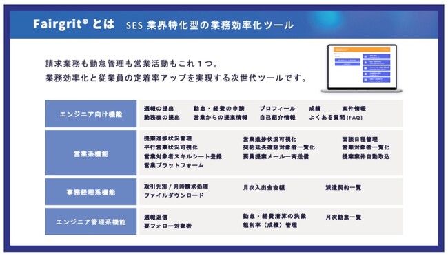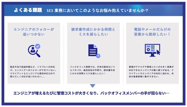 "SES業界向け統合業務効率化SaaS”と銘打っており、SES企業において常日頃行われている「営業」、「勤怠/請求」、「ITエンジニア管理」の3軸に関する業務を効果的に改善するための機能を提供する。