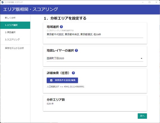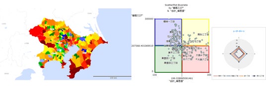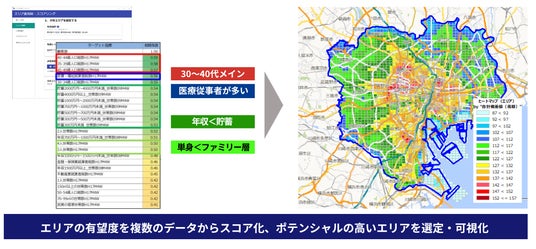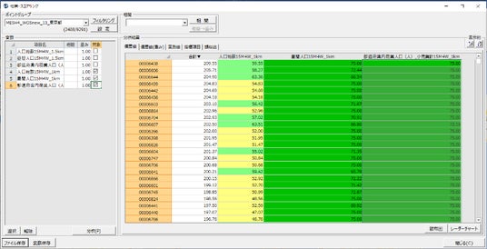 自社にとって優先すべき顧客(潜在顧客含む)が多く住むエリアを、自社店舗の売上等との相関から算出しGIS(地図情報システム)「MarketAnalyzer(R) 5」上に可視化できる機能です。販促や出店の有望エリアを選定する際に、「何が売上要因になっているのか」(相関分析)を行い、売上に貢献している複数の項目をスコア化することにより、有望エリアの選定が可能になります。その分析を通気一貫し実行できるエリア版相関・スコアリング機能をリリースします。自社の販売実績、店舗や顧客データをはじめ、周辺住民の世帯や年収、家族構成等の統計データ等、入手できるデータは数多くあるにも関わらず、その分析手法が複雑なため、売上予測や店舗分析に実際に使っているデータはごく少数になってしまうという顧客の課題に応えるべく、誰でも容易に複数のデータ軸を用いた相関分析や需要分析ができる機能を開発しました。(主なメリット)