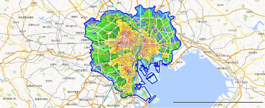 上記で導き出した合計スコアを、MarketAnalyzer(R) 5で地図上に可視化できます。暖色のエリアは、合計スコアが高いことを示しており、顧客(会員)データとの関連性が高いエリアであることが一目で分かります。