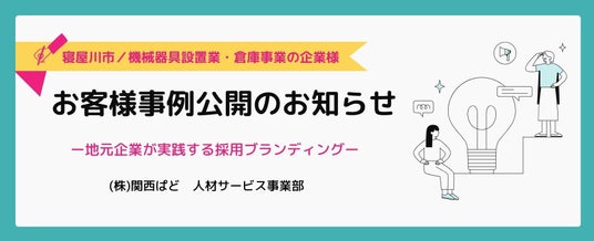 株式会社関西ぱど(本社:大阪市西区靭本町1-10-24 三共本町ビル5F 代表取締役 富岡 紀幸)は、採用活動における成功事例として、寝屋川市/気化器器具設置業・倉庫事業の企業様における「地元採用」への方針転換事例を公開しました。詳細は以下のリンクからご覧いただけます。