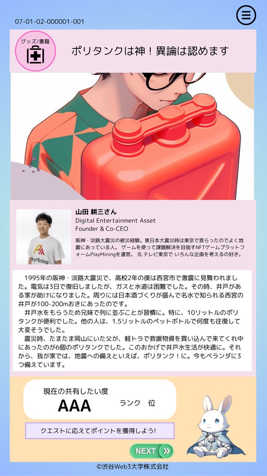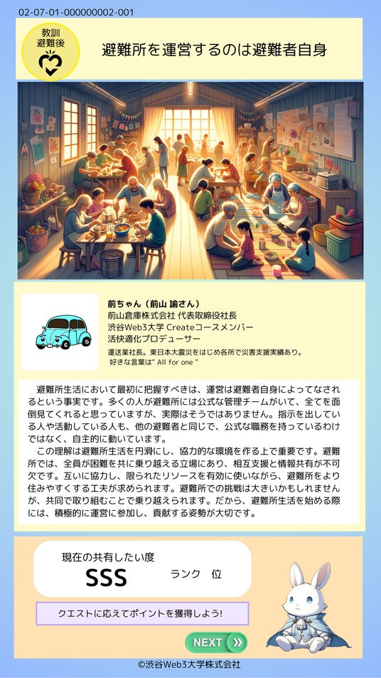 災害大国である日本では、被災経験者各人の内面に、過去の災害を通じて生まれた経験知が豊富に存在しています。しかしながら、そのような経験知は災害支援に十分に活かされておらず、結果的に「行き当たりばったり」な災害対策が行われてしまっている現状があり、デザクエは、先ずはその課題を解決するGameFiの文脈からムーブメントを一刻も早く開始します。