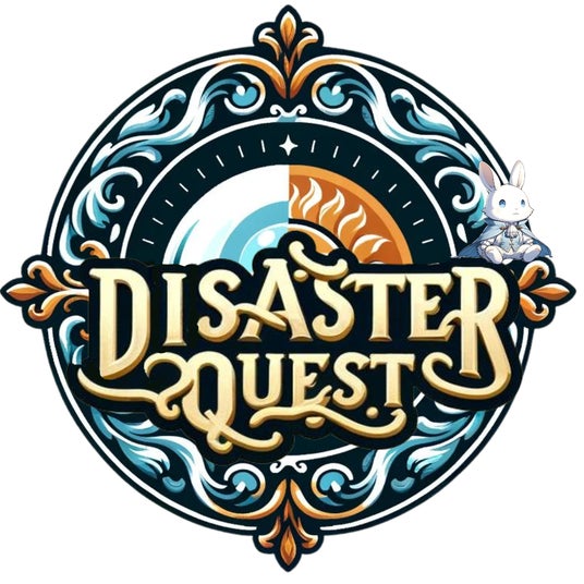 デザクエのロゴマーク。本マークの中心は、太陽と月で構成されていて、引力、太陽は自発的な意志、月は無意識、人間の二面性、時間帯により変化する災害対策の二面性をも表現している。ロゴマークに座り、カードにも出てくる“白うさぎ”は、災害対策のクエストへと導いてくれる使者である