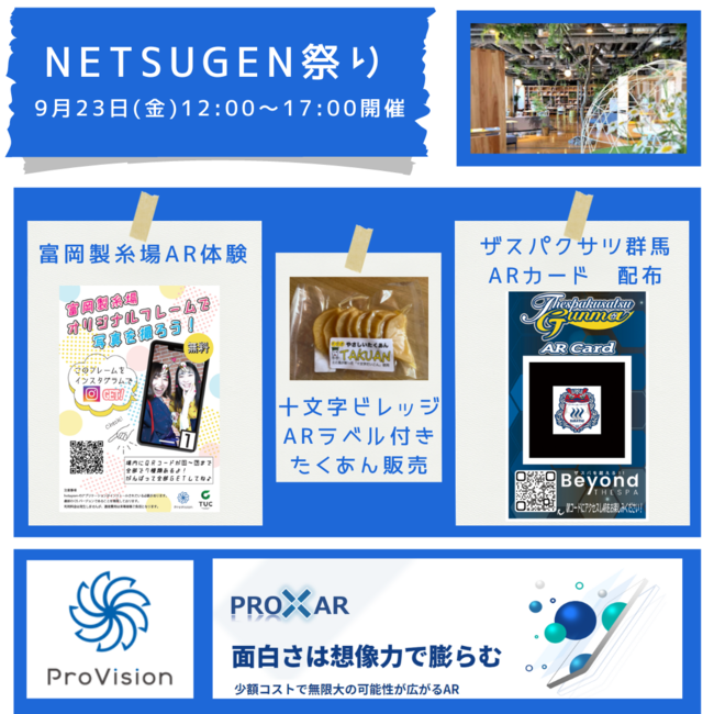 ProVisionは、NETSUGEN法人会員として、Jリーグに所属するサッカークラブ「ザスパクサツ群馬」とのコラボAR配布や、群馬県の富岡製糸場にご提供したARコンテンツの展示、十文字ビレッジとコラボしたAR付きたくあんの販売などを行いました。当日は多くのお客様にブースに足を運んでいただき、ARコンテンツに興味を持ってもらうきっかけになりました。