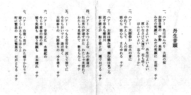 三重県・多気町丹生地区は、ご鎮座1500 年を迎えた丹生神社や丹生大師(丹生神宮寺)をはじめ、由緒ある寺院やまち並みなどが数多く残されている地域です。この丹生地区の歴史を歌詞にし、地域で踊られてきた「丹生音頭」があります。歌詞には地元の名所や文化、そして丹生に暮らす人の光景が盛り込まれています。