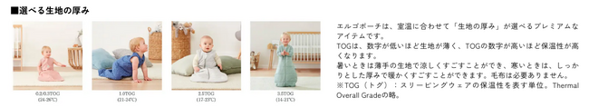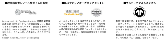 またスリープウェアは、人間工学に基づきデザインされており、特に睡眠のお悩みが絶えない新生児から成長に合わせて段階的に、すべてのお子さんが安全に眠れるように準備されています。