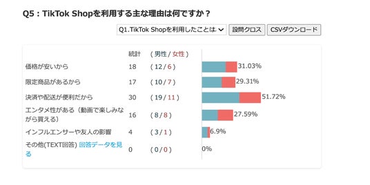 TikTok Shopを利用する主な理由として最も多かったのは、「決済や配送が便利だから」(51.72%)、次いで「価格が安いから」(31.03%)、「限定商品があるから」(29.31%)でした。(図5)