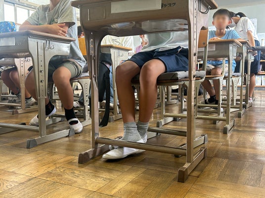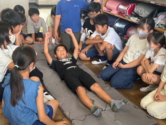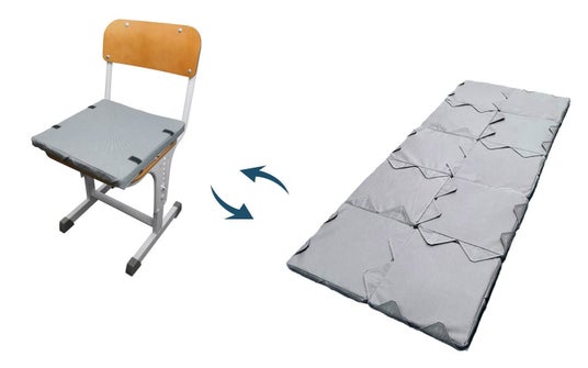 左)普段は学校の椅子のクッションとして 右)被災時は複数枚集めて防災マットとして