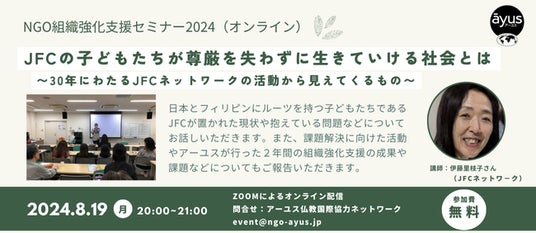 日本とフィリピンにルーツを持つ子どもたちであるJFCが置かれた現状や抱えている問題などについてお話を伺い、アーユスが行った2年間のNGO組織強化支援の成果や課題などについてもご報告いただきます。