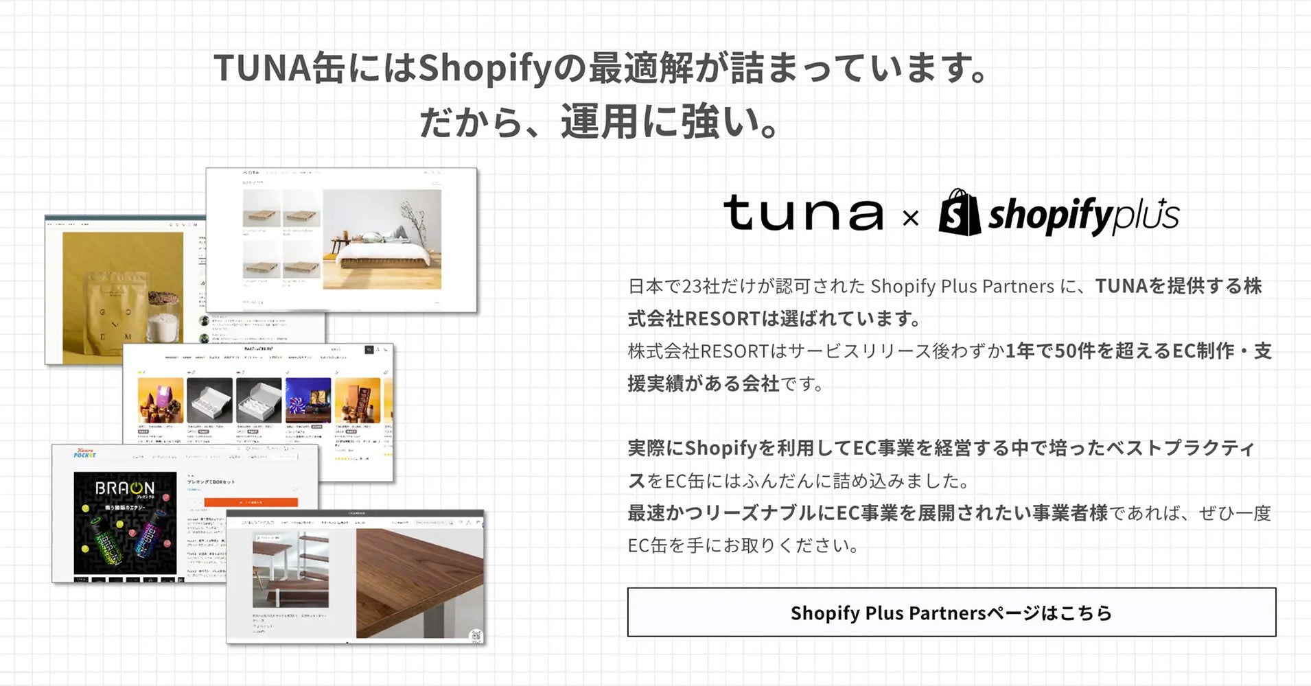 【 tuna 】ECパッケージで本格支援するチームRESORTが手がける、運用に強いShopifyのEC構築パッケージの名称です。「tuna-THE EC缶」は自らEC事業を運営している会社が導き出した、ECのノウハウ、経験値を凝縮。多くの企業がハマる落とし穴を事前に塞ぎ、事業成長及び拡大への最短距離を提示します。